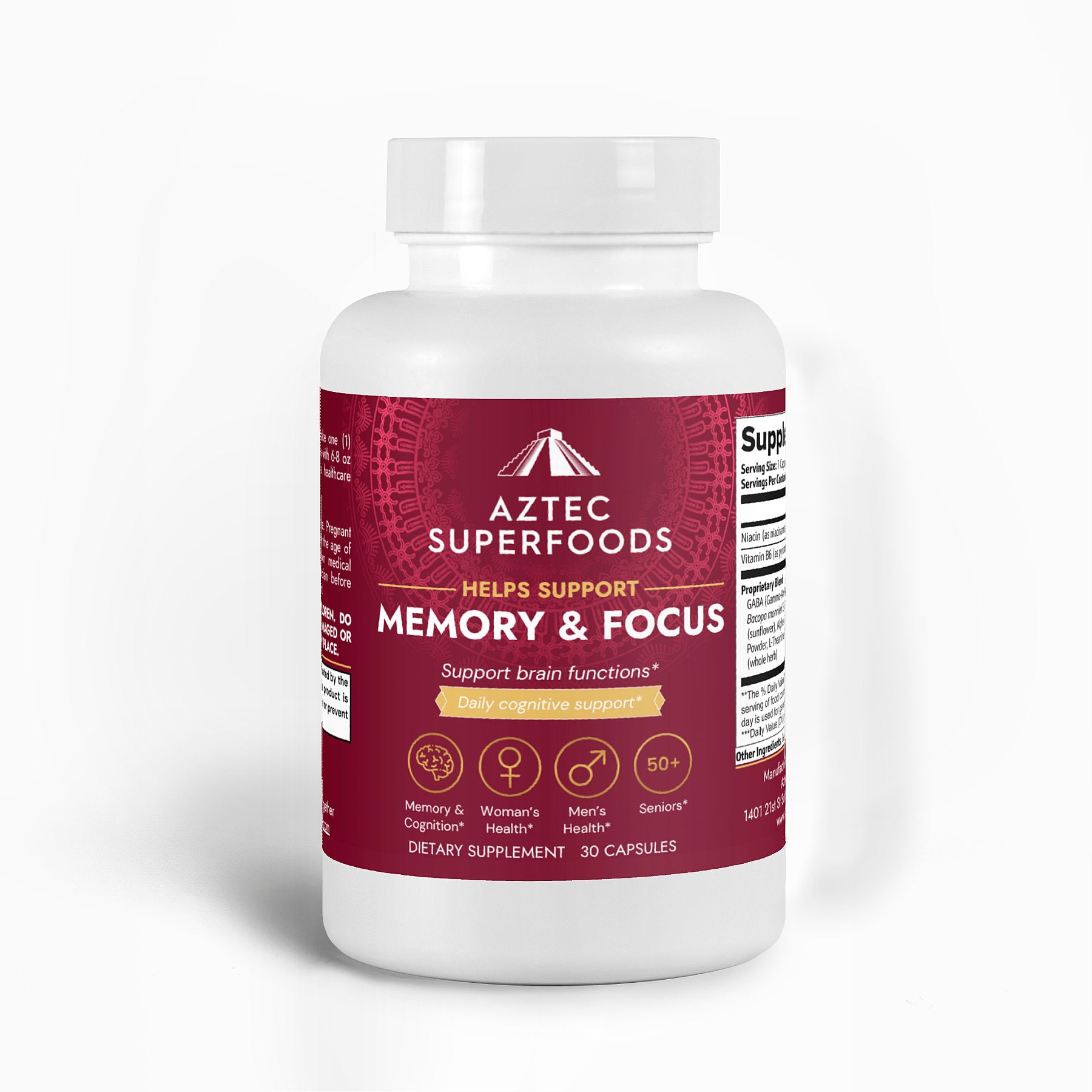 Ingredients: Niacin (as niacinamide); Vitamin B6 (as pyridoxine hydrochloride); GABA (Gamma-Aminobutyric Acid), L-Tyrosine, Caffeine, Bacopa monnieri Extract (whole herb), Phosphatidylserine 20% (sunflower), Alpha GPC (Alpha -glycerylphosphorylcholine) Powder, L-Theanine, Huperzine A 1% (Huperzia serrata) (whole herb)