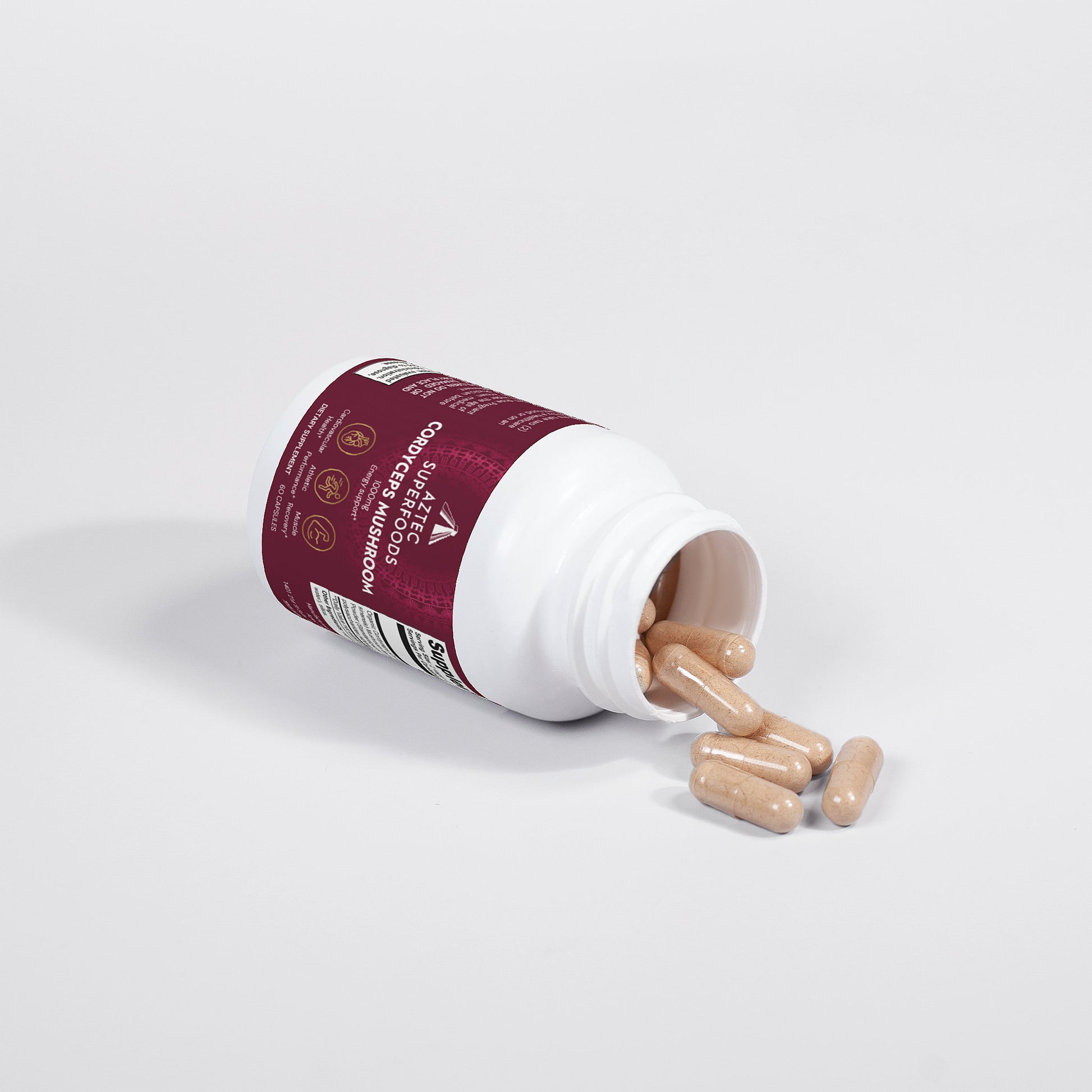 Ingredients: Organic Cordyceps (Cordyceps Sinensis), Mushroom Mycelium Powder (Standardized to 40% polysaccharides [400mg]), Organic capsule (pullulan, water), organic rice hull.
