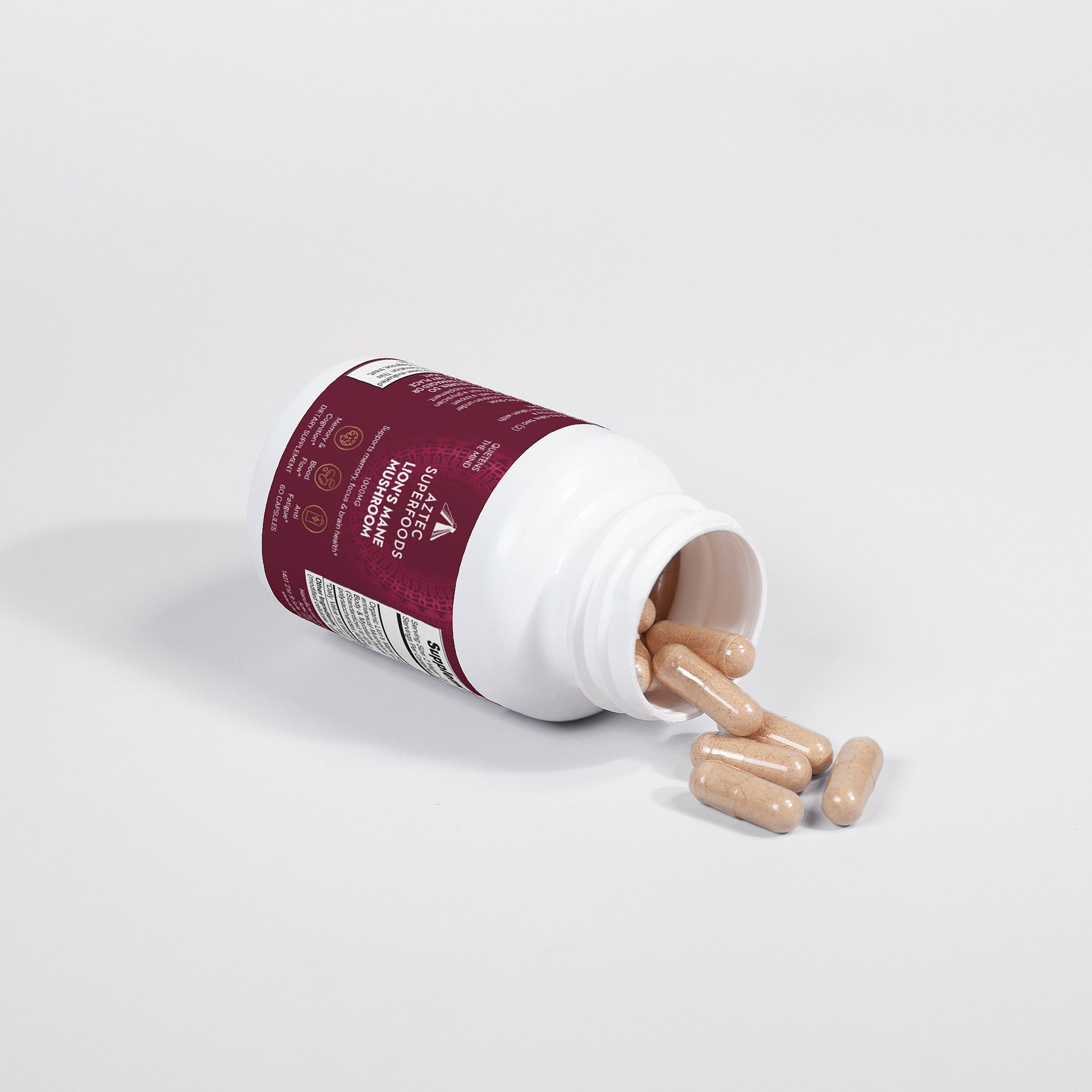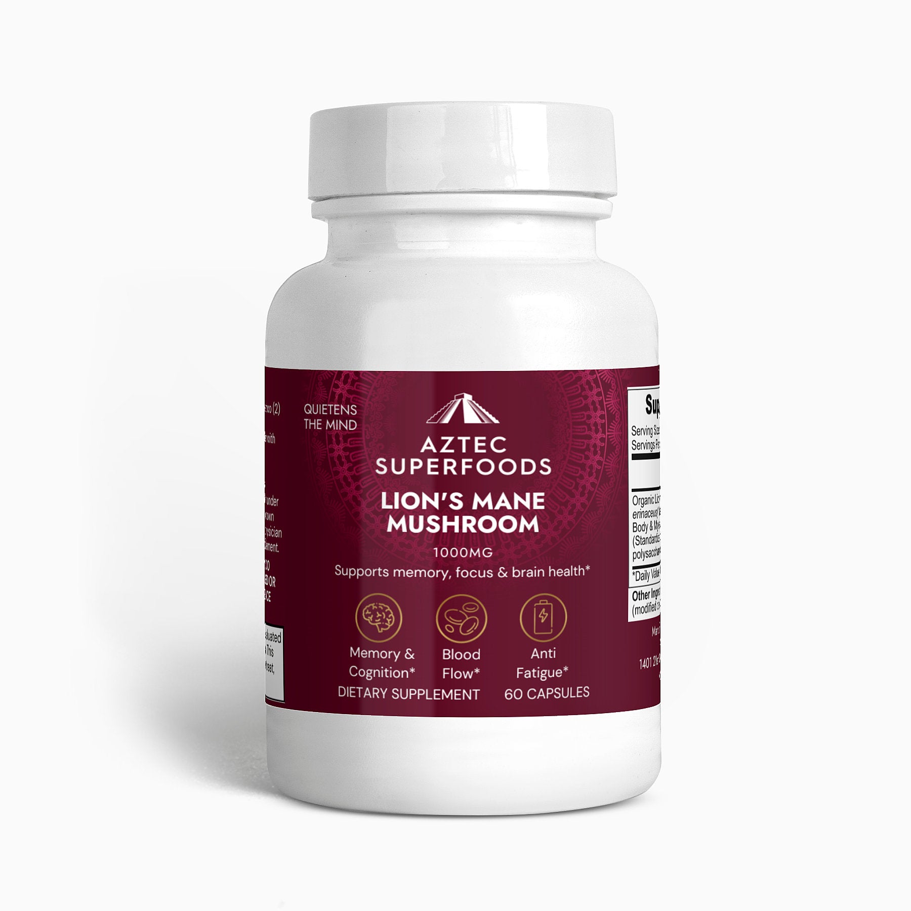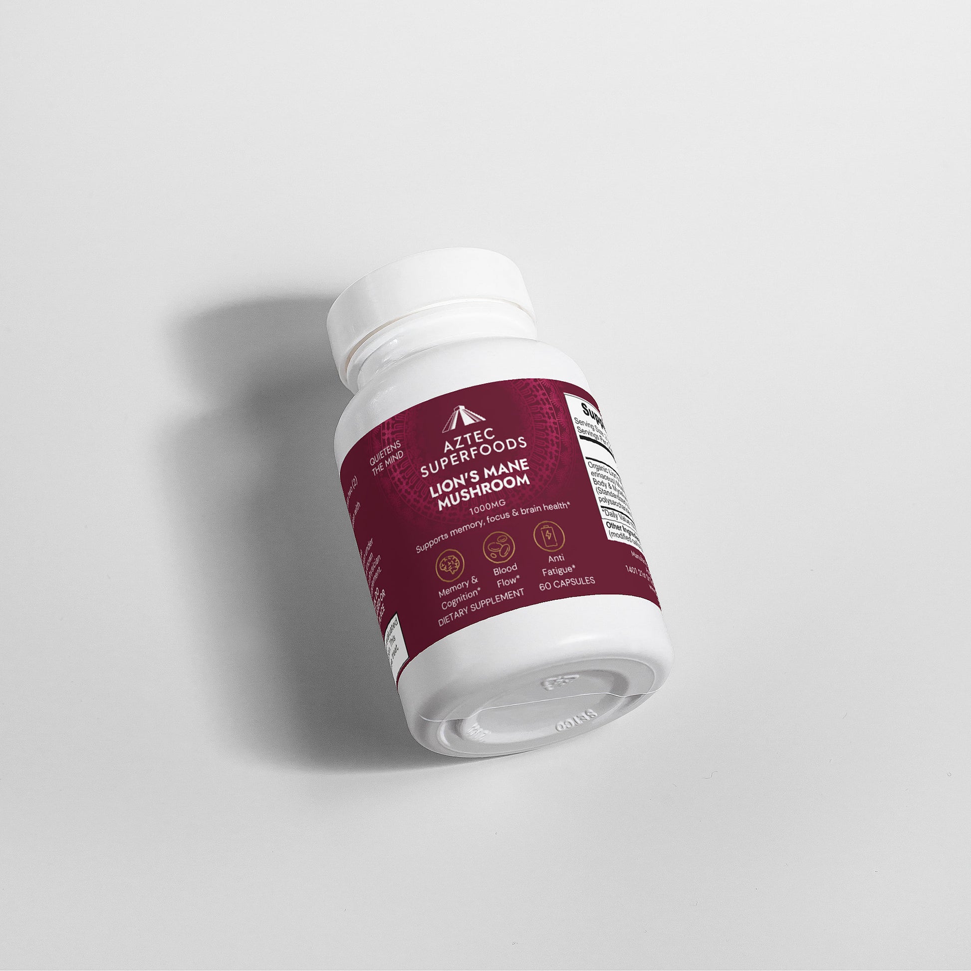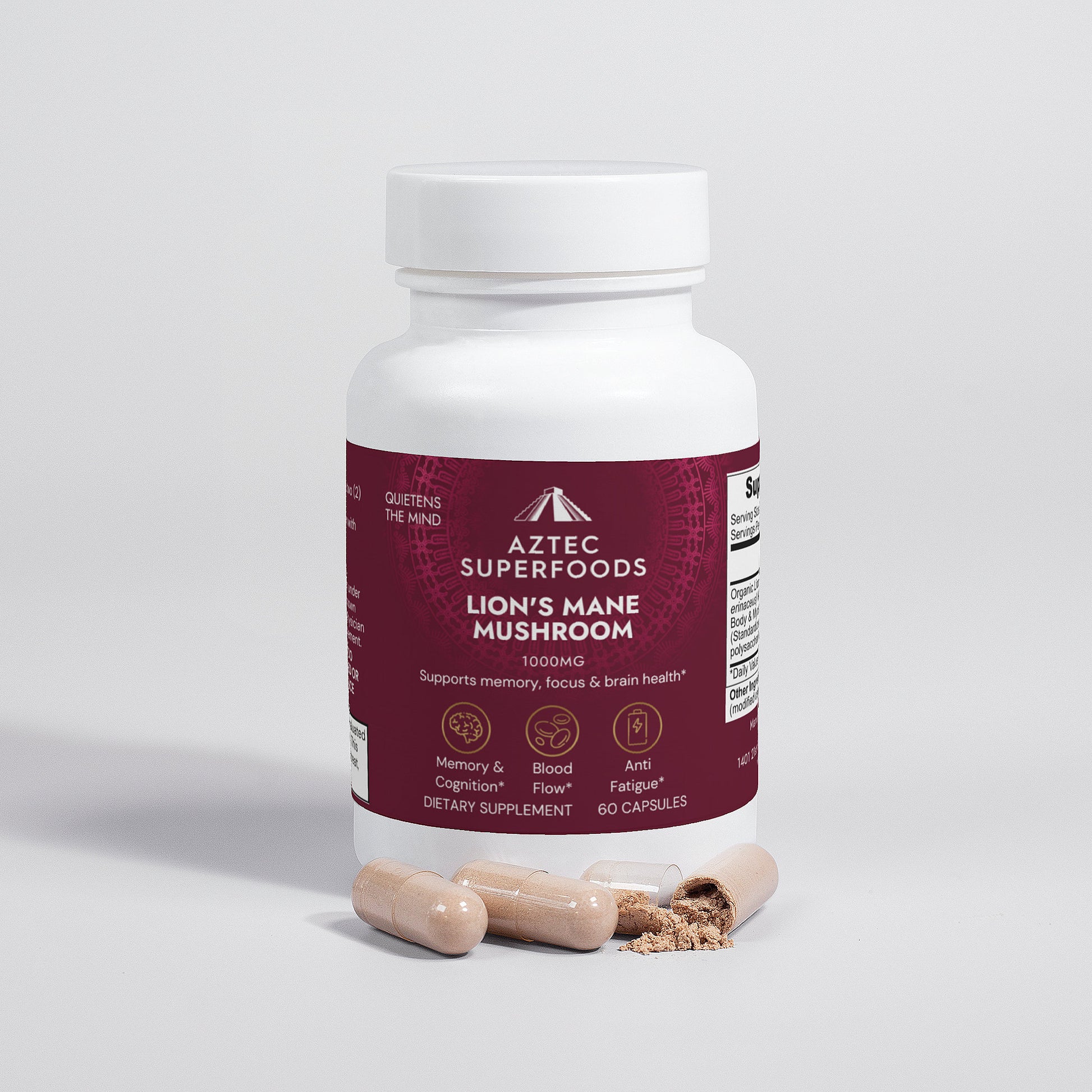 Ingredients: Organic Lion’s Mane (Hericum erinaceus) Mushroom Fruiting Body & Mycelium Powder (Standardized to 40% polysaccharides [400mg]), Organic capsule (pullulan, water), organic pea starch.